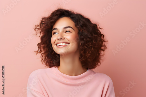 Close-Up Portrait of a Cheerful Young Woman, Brimming with Curiosity and Cleverness, Soft pink Pastel Background.