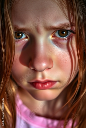 Close-Up Portrait of a Concerned Young Girl with Brown Hair and Intense Eyes