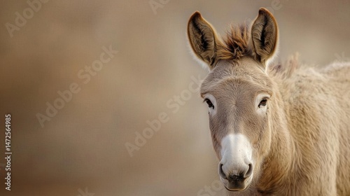 Close-up portrait of a donkey. the donkey is facing the camera and is looking directly at the camera. it has a light brown coat with a white nose and ears that are slightly pointed.