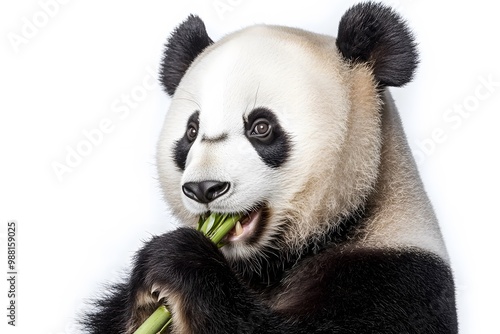 Close-up portrait of a giant panda eating bamboo against a white background.