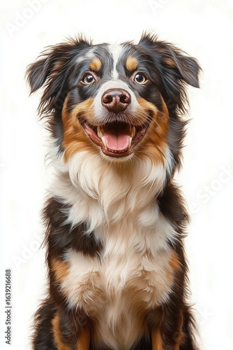 Close-up portrait of a happy, fluffy dog with tri-color fur looking forward with a joyful expression and mouth open against a light background