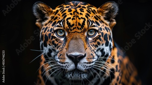 jaguar, portrait, animal, wildlife, closeup, face, eye, intense, gaze, pattern, spot, rosette, fur, black, background, dark, wild, predator, big, cat, nature, jungle, amazon, south, america, mammal, carnivore, powerful, beautiful, majestic, felino, sharp, teeth, claw, hunter, wildcat, fauna, photo, photo