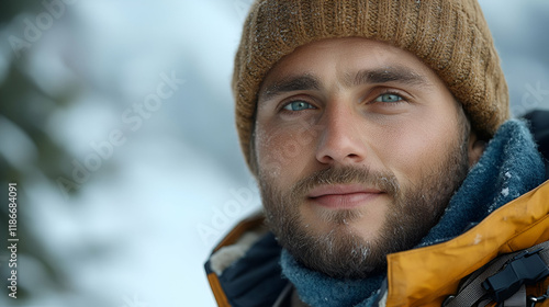 man, winter, portrait, snow, cold, face, beard, eye, blue, expression, serious, calm, outdoors, nature, frost, hat, knitted, jacket, foulard, clothing, snowy, landscape, mountain, closeup, male, model, photogenic, adult, person, human, weather, season, photo, image