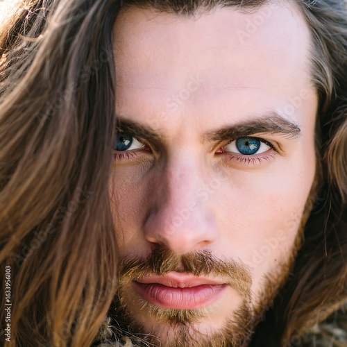 man, portrait, face, eye, blue, hair, long, brown, intense, gaze, closeup, photogenic, model, male, beard, stubble field, expression, serious, attractive, look