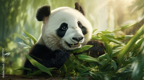 Close-up portrait of a panda among bamboo leaves. The concept of the national symbol of China, representing sincerity, friendliness, tolerance and kindness.