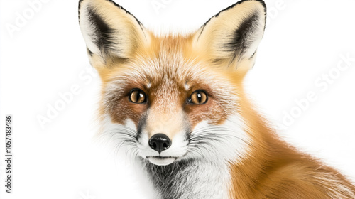 Close-up portrait of a red fox with orange fur, large pointed ears, and watchful amber eyes on a white background