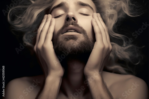 closeup, portrait, young, man, beard, hide, closed, eye, face, hand, black, background, cover, dream, bliss, rest, relaxed, joy, pleasure, delight, happiness, heaven, lifestyle, thought, long, hair, consideration, drug, addiction, high, narcotic, expression, mental, health, issue, cephalalgia, isolated, person, human, secrecy, head, 1, model, studio, minimalist, concept, illustration