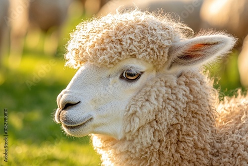 Close-up portrait of a sheep with fluffy white fleece, looking to the side with a gentle expression in a field.