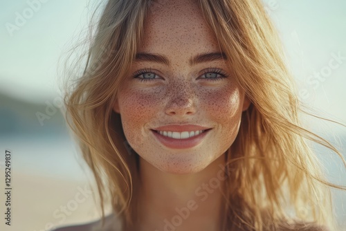 Close-up portrait of a smiling freckled woman with blonde hair. Ideal for beauty, skincare, or summer themes.