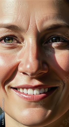woman, female, face, portrait, smile, happy, joy, cheerful, expression, eye, nose, mouth, teeth, skin, wrinkle, line, forehead, cheek, chin, human, person, individual, adult, beauty, natural, genuine, authentic, emotion, feeling, light, sunlight, bright, daytime, closeup, detail, head shot, candid, real, healthy, positive, optimistic, content, serene, warm, friendly, approachable, attractive, pretty