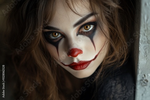 woman, face, portrait, make-up, clown, smile, eye, lip, red, black, white, dark, mysterious, skittish, creepy, halloween, costume, carnival, performance, theatrical, artist, art, entertainment, beauty, fashion, look, expression, emotion, character, scarey, festive, celebration, party, fun, joy, joyful, fantasy, imagination, whimsical, magical, magic, dramatic, bold, creative, artistic, fear