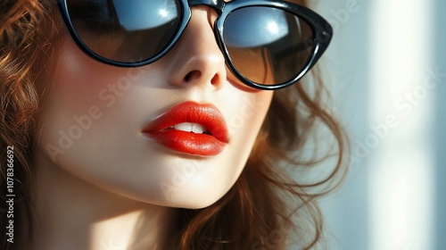 woman, face, sunglasses, red, lip, eye, beauty, fashion, style, model, closeup, portrait, girl, glamour, chic, trendy, summer, sun, bright, look, attractive, beautiful, elegant, gorgeous, make-up, hair, eyebrow, skin, smile, teeth, eyeglass, accessory, female, young, casual attire, cool, stylish, contemporary, feminine, sexy, sensual, soft, smooth, gentle, refined, sophisticated, natural