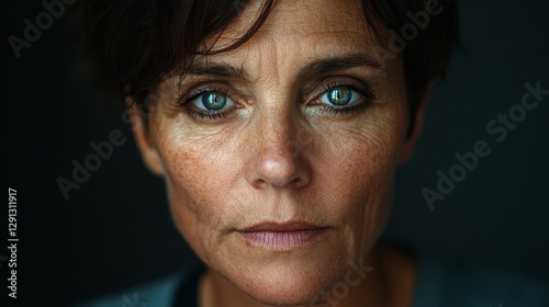Close-up portrait of a woman with captivating blue eyes, showcasing natural beauty and emotion