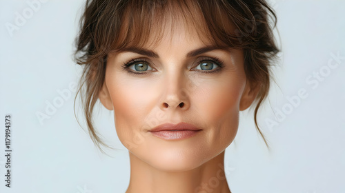 woman, portrait, face, closeup, beauty, eye, mature, skincare, ageing, expression, natural, coiffure, cosmetic, make-up, female, head shot, wrinkle, line, complexion, beautiful, aesthetic, elegant, confident, serene, calm, wellness, lifestyle, health, facial features, gaze, lip, hair, brown hair, green eye, light background, studio shot, photo, simple, clean, minimalist, genuine, authentic, real, no makeup, middle-aged