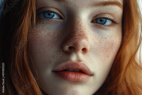 Close-up portrait of a woman with freckles on her face, suitable for beauty and personal use