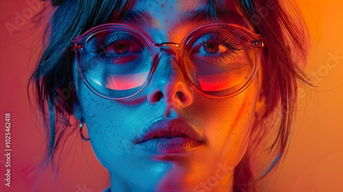 Close-up Portrait of a Woman with Glasses and Colorful Lighting