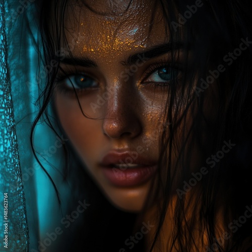 woman, portrait, closeup, intense, eye, glistening, skin, wet, face, beautiful, pretty, attractive, long, hair, dark, make-up, natural, lash, lip, pink, lipstick, glowing, gold, sparkle, sharpened, detail, model, photo, photo, art, fashion, glamour, beauty, dramatic, lighting, tone, blue, colours, cool, texture, style, glamourous, sophisticated, powerful, elegant, fierce, modern, seductive