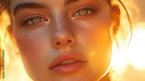 Close-up Portrait of a Woman with Green Eyes in Golden Sunlight