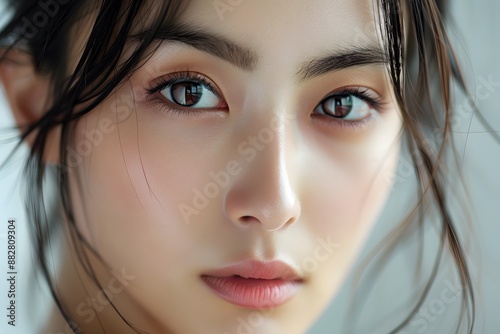 portrait, woman, closeup, natural makeup, beauty, brown eyes, black hair, minimalistic, serene, calm, youthful, gentle, feminine, elegance, simplicity, modern, contemporary, artistic, photo, head shot, face, detailed, hi-res, intimate, personal, aesthetic, model, fashion, clean, pure, natural light, sharpened, depth of field, fresh face, natural beauty