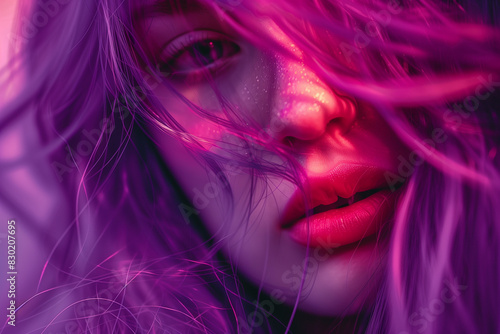 pink, purple, woman, closeup, portrait, high-coloured, colourful, mysterious, feminine, beauty, sensual, eye, face, fashion, coiffure, glamour, make-up, stylish, artistic, glow, expression, mood, lighting, creative, individuality, lip, skin, detail, photo, aethereal, contemporary, mystique, allure, bold, conceptual, trendy, vibrant, eye-catching, hair, model, person, make-up, closeup