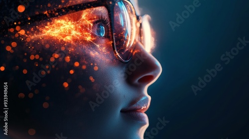 woman, eye, face, goggles, sparkle, closeup, portrait, blue, orange, light, glare, bright, shine, glow, lens, eyelash, lip, skin, cheek, nose, profile, close, up, view, sharpened, dark, background, abstract, art, digital, artistic, modern, futuristic, trendy, style