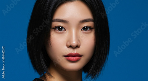 portrait, woman, asian, beauty, make-up, flawless, skin, eye, deep, captivating, natural, studio, closeup, face, lip, hair, black, blue, background, model, glamour, fashion, cosmetic, elegant, sophisticated, detail, high-quality, professional, photo, studio shot, portraiture, modern, contemporary, glamourous, attractive, confident, expression, still life, light, lighting, soft, sharpened, sharp