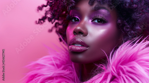 woman, portrait, make-up, pink, closeup, vibrant, beauty, fashion, curly hair, afro, glamourous, stylish, female, model, elegant, chic, bold, cosmetic, glowing, face, striking, luxurious, trendy, colourful, skin, eyeshadow, lipstick, eyelash, sophisticated, coiffure, texture, femininity, expressive, intense, confident, radiant, youthful, poised