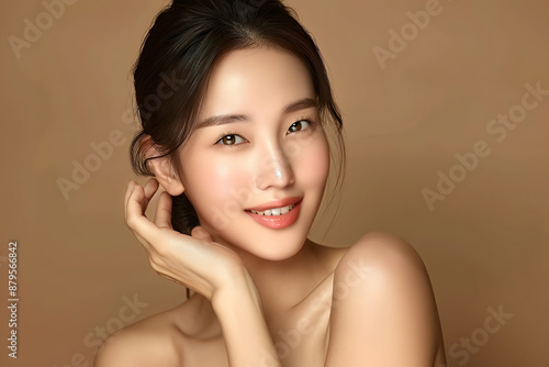 Close-up portrait of a young Asian woman with a natural glow and subtle makeup, highlighting flawless skin and serene expression.