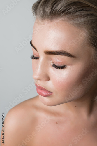 Closeup portrait of a young girl with long eyelashes and nude makeup