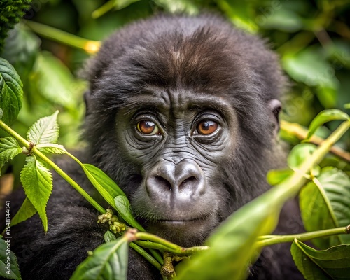 Close-up portrait of a young mountain gorilla in lush green rainforest vegetation