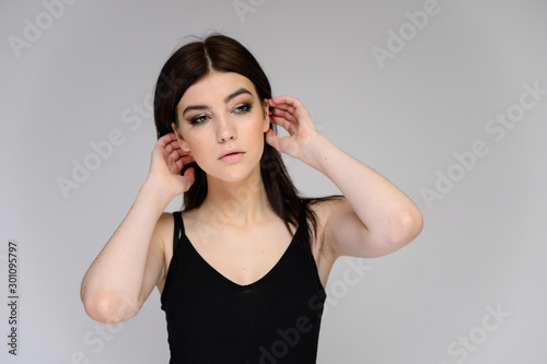 Close-up portrait of a young pretty girl student with long black hair, on a white background. He stands right in front of the camera, showing his hands in different poses with different emotions.
