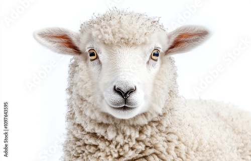 Close-Up Portrait of a Young Sheep with Soft Wool and Expressive Eyes Against a Clean White Background for Agricultural or Farm-Themed Use
