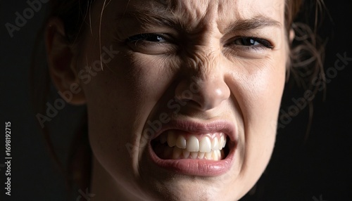 woman, female, girl, face, expression, angry, furious, rage, frustration, upset, annoyed, irritated, teeth, clenched, jaw, eye, brow, forehead, wrinkle, frown, scowling, stress, tension, emotion, feeling, human, portrait, closeup, detail, dark, background, shadow, light, skin, hair, young, adult, intense, powerful, mood, negative, displeasure, discontent, aggravation
