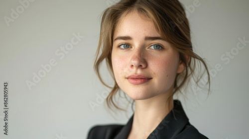 portrait, young, woman, presenter, professional, setting, neutral, background, conveying, confidence, approachable, demeanor
