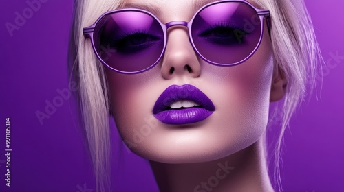 Close-up portrait of a young woman with blonde hair wearing purple sunglasses and lipstick against a violet background.