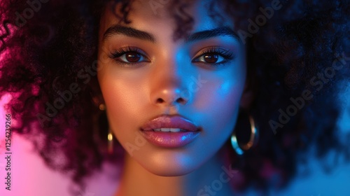 portrait, woman, curly, hair, neon, light, closeup, vibrant, young, feature, pink, blue, hue, earring, beauty, glowing, eye, lip, fashion, style, artistic, modern, lighting, creative, photo, face, expression, elegance, skin