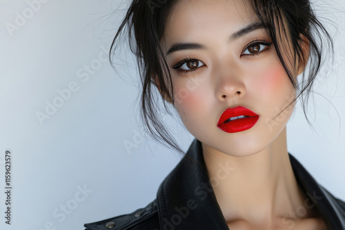 Close-up portrait of a young woman with flawless makeup, striking red lips, and dark hair.