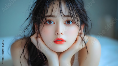 lip, natural beauty, black hair, light, bokeh, white, eye, minimalist, flawless, studio, hair, innocent, beauty, style, closeup, calm, serene, elegant, pensive, hand, soft light, chin, dreamy, photoshoot, smooth, gentle, long hair, face, direct, model, simple, fashion, female, skin, woman, pure, portrait, background, looking, natural, blur, soft, resting, expression