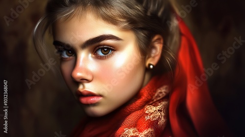 woman, portrait, closeup, face, eye, hair, blond, foulard, red, skin, lighting, warm, intimate, allure, gaze, enigmatic, expression, young, female, caucasian, fashion, beauty, style, model, photo, studio