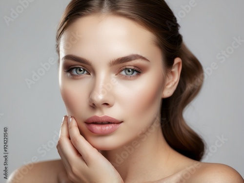 Close-up Portrait of a Young Woman with Smooth Skin and Gray Eyes