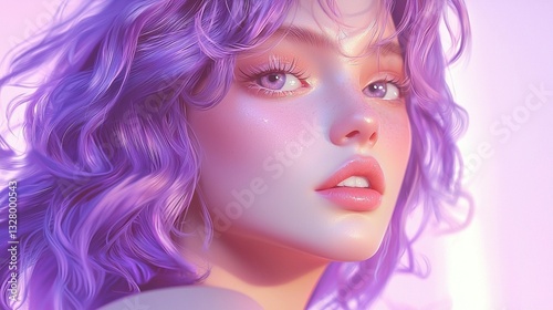 woman, girl, face, portrait, closeup, hair, purple, curly, eye, make-up, lip, skin, beauty, fashion, model, style, pretty, cute, attractive, young, adult, female, person, head, shoulder, expression, look, glance, dreamy, soft, light, glow, fantasy, art, digital, illustration, graphic, image, photo, picture, aesthetic, vibe, mood, pastel, colours, vibrant, delicate, feminine, elegant