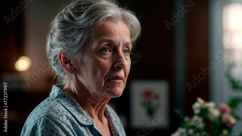 woman, old, lady, person, closeup, portrait, dementia, sorrowful, interior, loneliness, ai