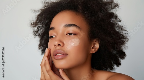 beautiful, black, woman, curly, hair, applying, face, cream, cheek, white, background, closeup, portrait, photo, studio, shot, skincare, product, advertising, soft, light, minimalist, high, resolution, detailed, radiant, glowing, fresh, clean, smooth, healthy, vibrant, confident, natural, elegant, refined, sophisticated, serene, aglow, expressive, intimate, clear, youthful, modern, professional, stylish, delicate, graceful