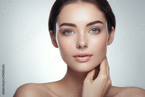 Closeup portrait of beautiful girl getting skin antiaging treatment .Light clean background. Generative Ai