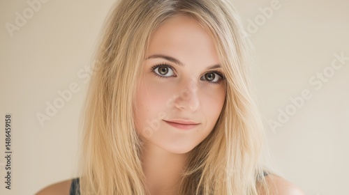 Close-up portrait of beautiful smiling blonde young woman with brown eyes posing against a neutral background, showing confidence and natural beauty