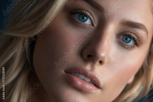Close-up portrait of blonde model with blue eyes
