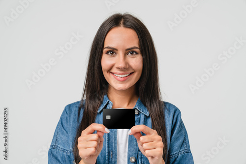 Closeup portrait of caucasian young woman bank client customer holding credit card for online payments e-commerce, transactions, cashback, loan isolated in white background