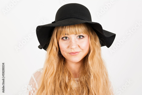woman, face, closeup, portrait, fashion, hat, hair, long, blond, skin, make-up, smile, smiling, beautiful, cute, pretty, bang, floppy, black, caucasian, head shot