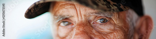 closeup, face, eye, wrinkle, skin, camouflage, cap, baseball cap, hat, grey hair, brown eyes, aged, old, portrait, man, person, senior, facial features, expression, texture, detail, human, old age, head, ear, forehead, eyebrow