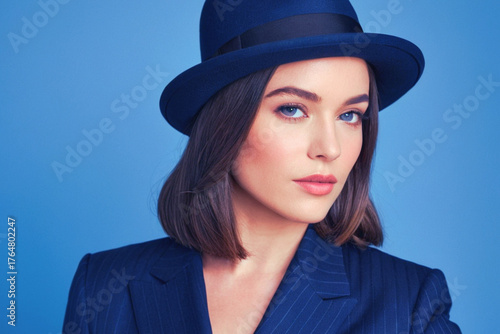 portrait, closeup, head shot, fashion, style, fedora, hat, navy blue, pinstripe, blazer, suit, elegance, stylish, confident, business, professional, formal, beauty, make-up, short hair, one person, studio shot, blue background, monochromatic, sophisticated, chic, powerful, female, retro